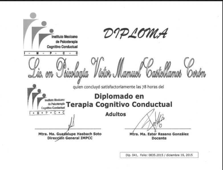 - Diplomado Insituto Mexicano de Psicoterapia Cognitivo Conductual (2015)