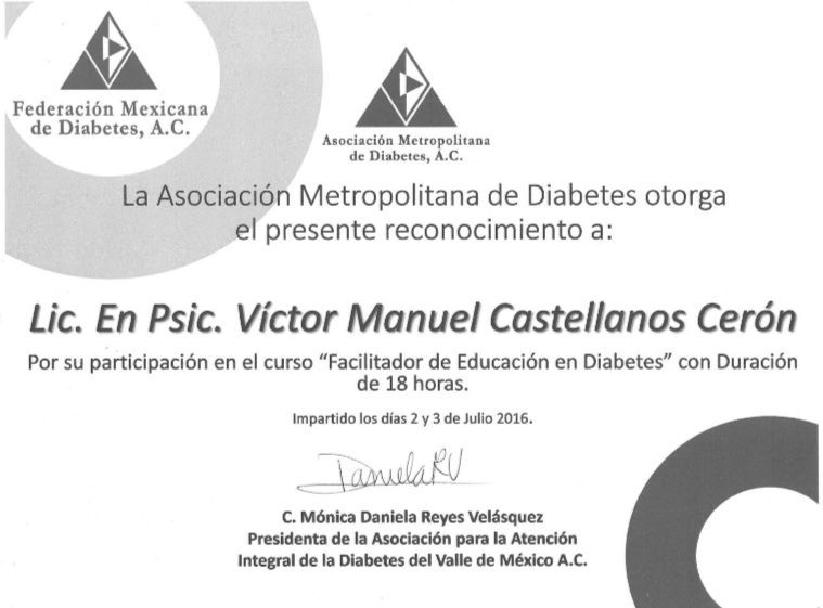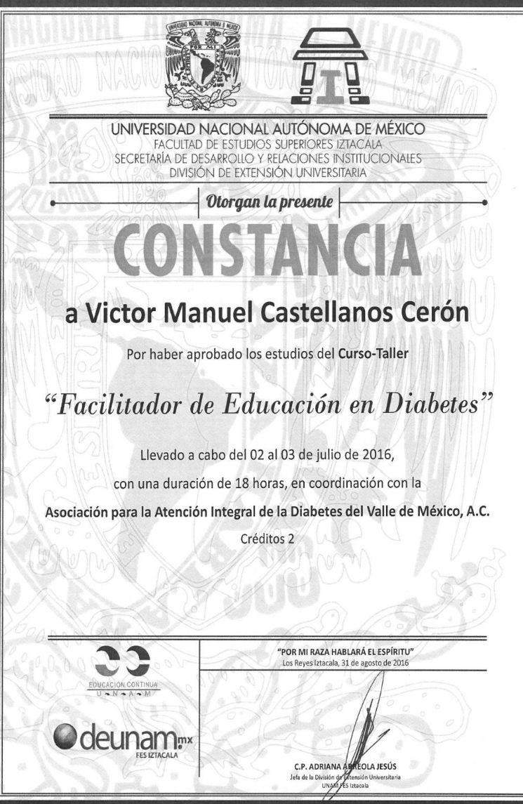 - Diplomado Educador en diabetes. Asociación Metropolitana de Diabetes, Federación Mexicana de Diabetes, UNAM (2016)